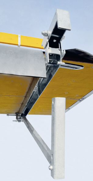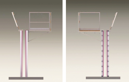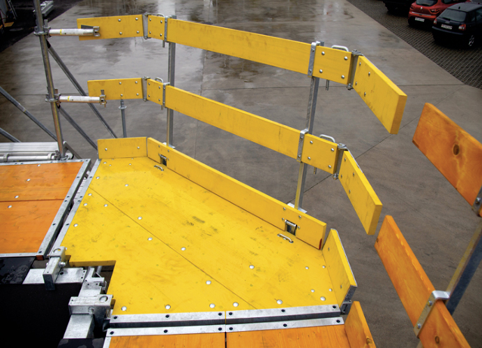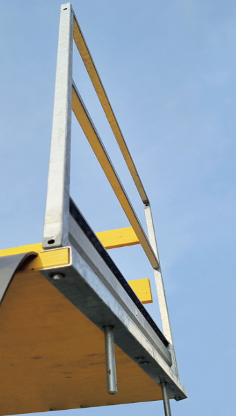 Unsere Eck- und Ausgleichsbühnen sind ebenso wie die Standard-Betonierbühnen mit Geländern ausgestattet, die über einen Einklappmechanismus verfügen.